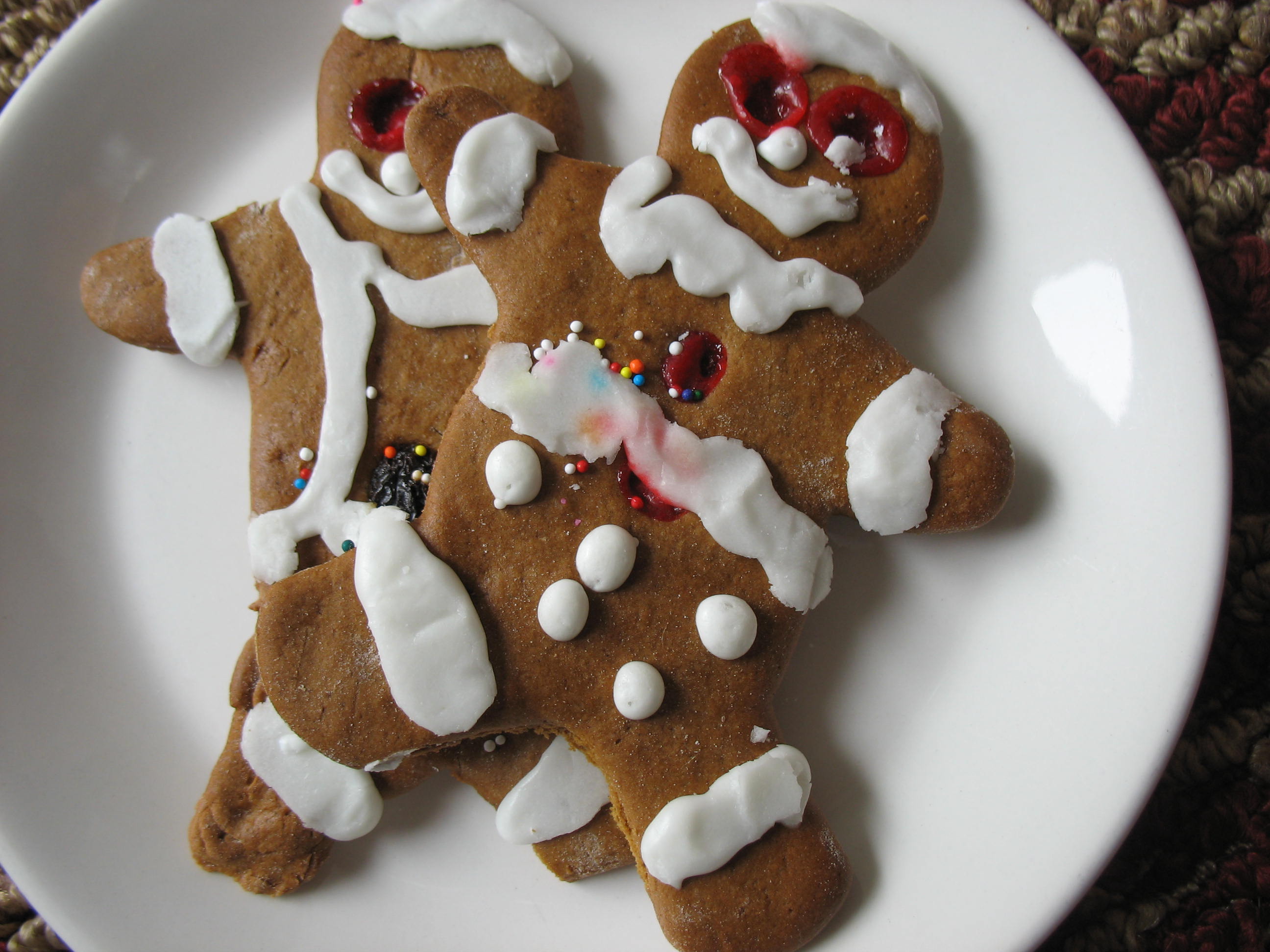 A beloved family friend makes and delivers these bad boys/girls a few days before Christmas. I am shameless in the fact that I will hide a few for my own personal stash. Once, when my small nieces where visiting over Christmas, I actually hid the platter and then would sneak a limb or torso here and there until there were no more raisin buttons or cinnamon Red Hot eyes to pluck. My actions filled me with remorse. My sweet nieces would have loved a gingerbread man. I confessed, albeit after the fact. I was duly chastised, yet secretly delighted I had eaten so many.