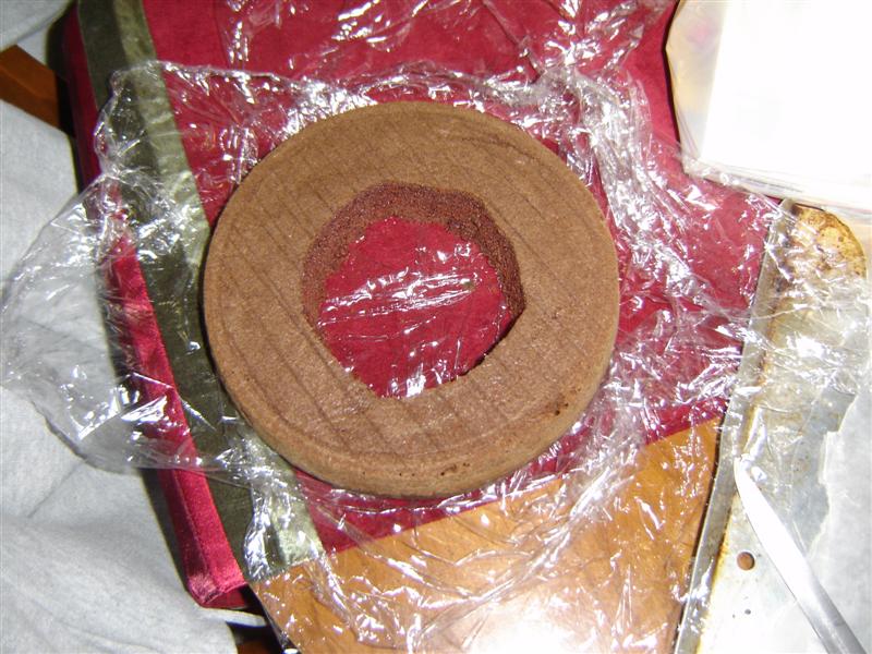 #2: Take one cake layer and cut out an inner circle to serve as the elephant’s head. Cut the rest into 5 pieces: 4 equal pieces to be used as legs and one longer piece for trunk.
