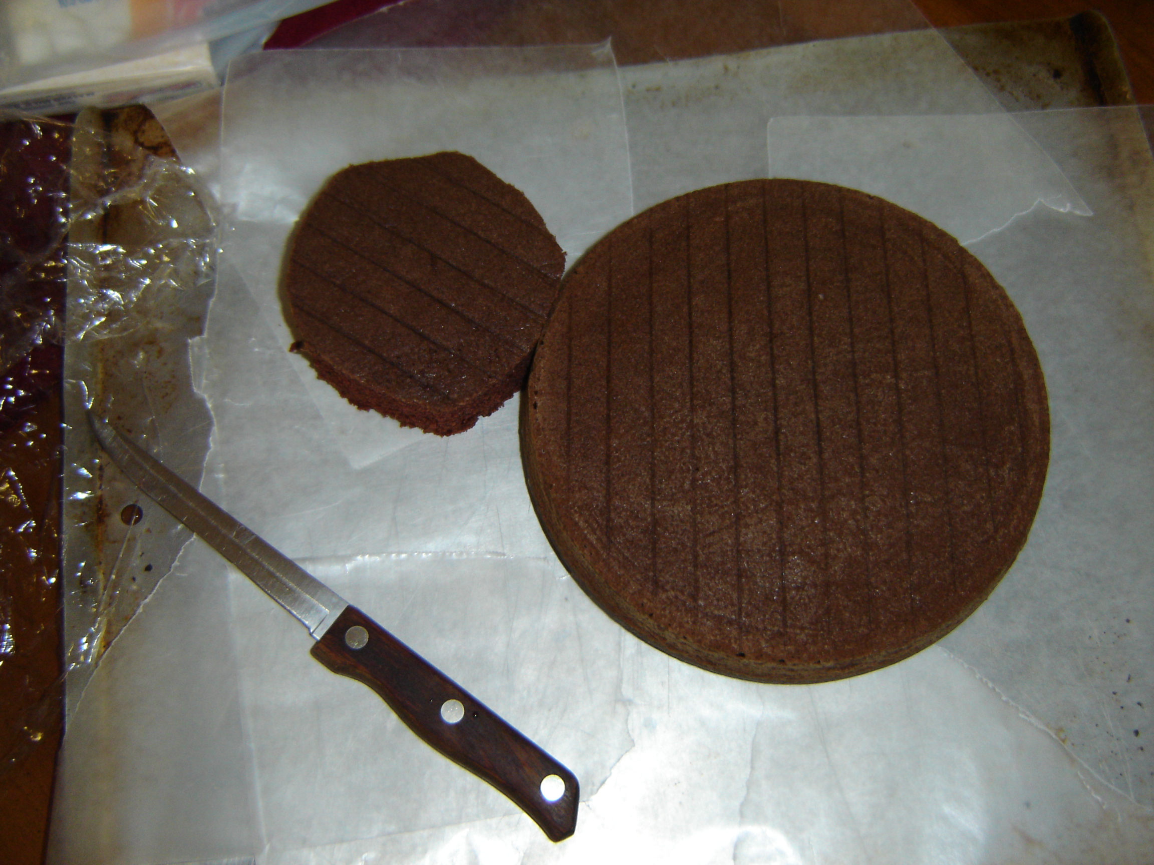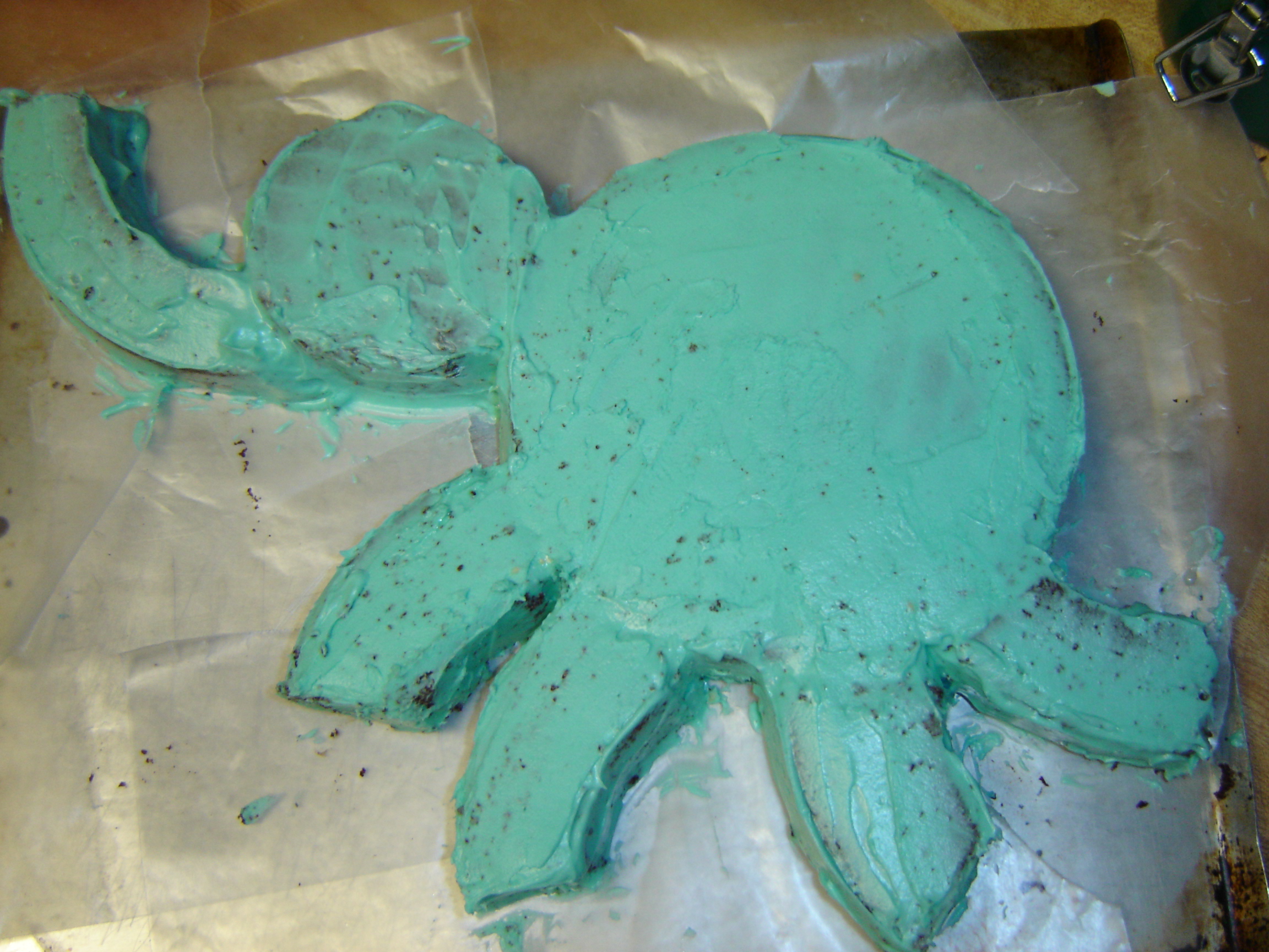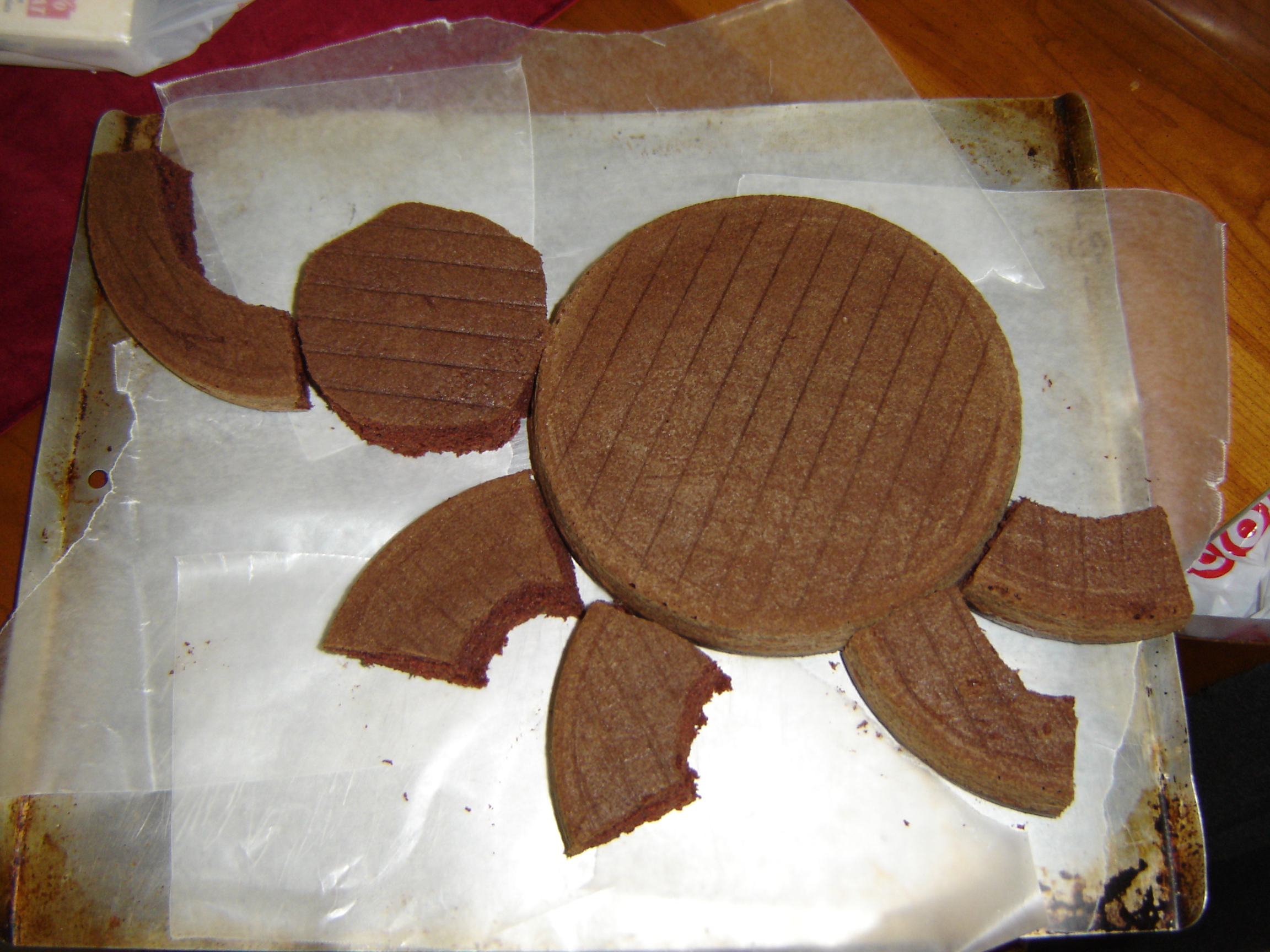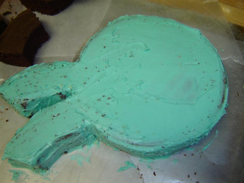 #3: Line a large flat-edged cookie sheet (or where you plan to construct and frost cake) with strips of wax paper and lay down the uncut cake layer and the cut-out piece for the head.