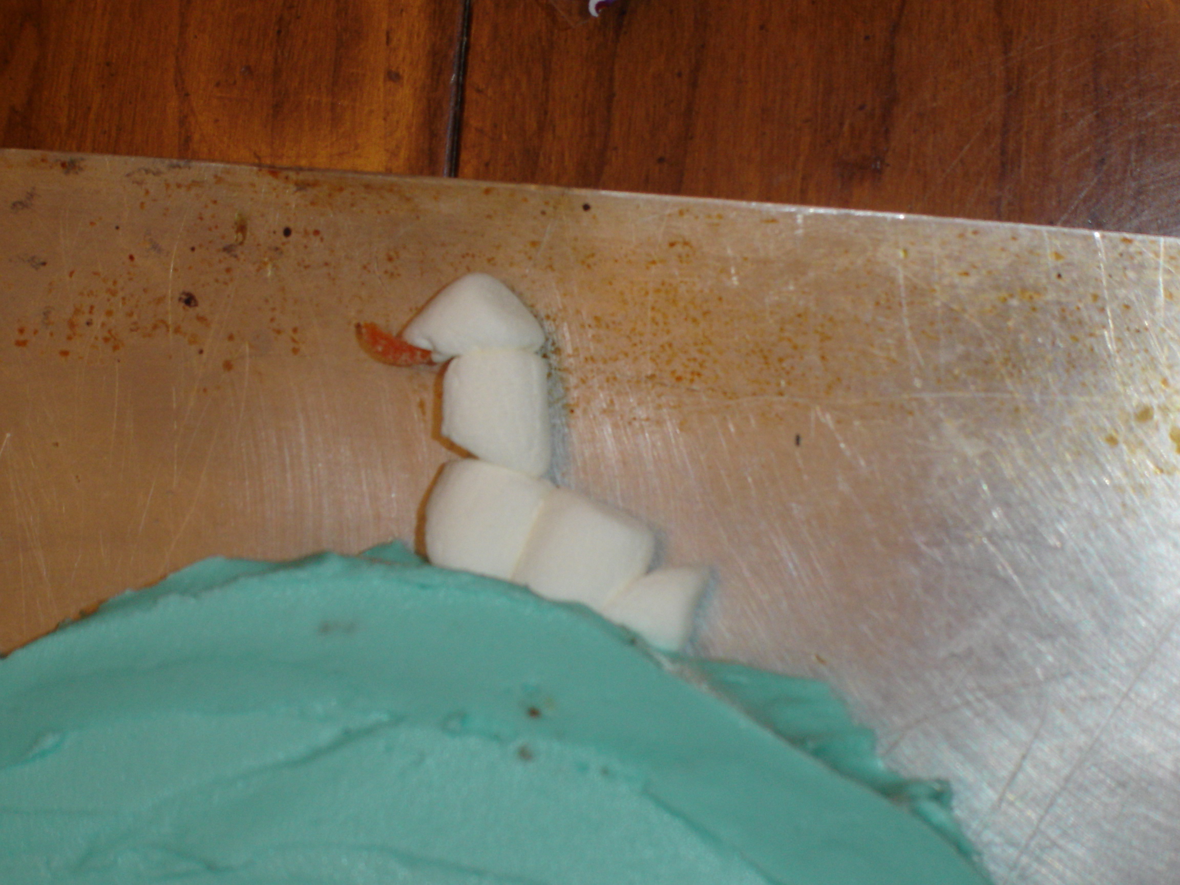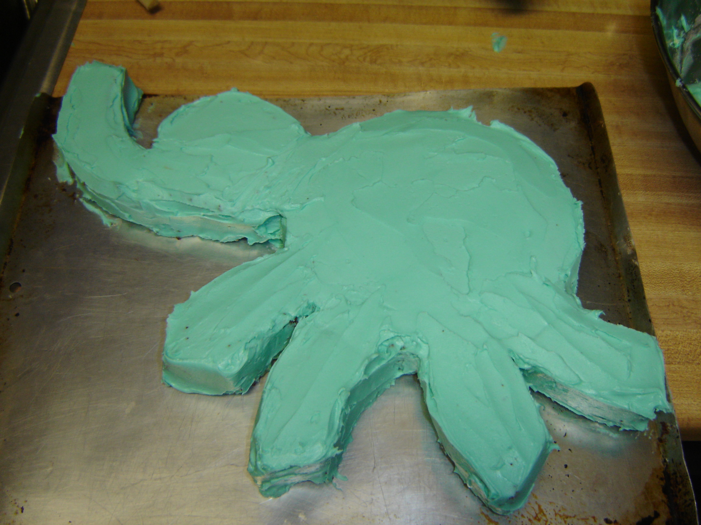 #5: Remove the trunk/leg pieces, remembering where you want them to go, and frost the body with a thin crumb-coat. Frost each leg/trunk, reassembling as each piece gets a light crumb-coat.