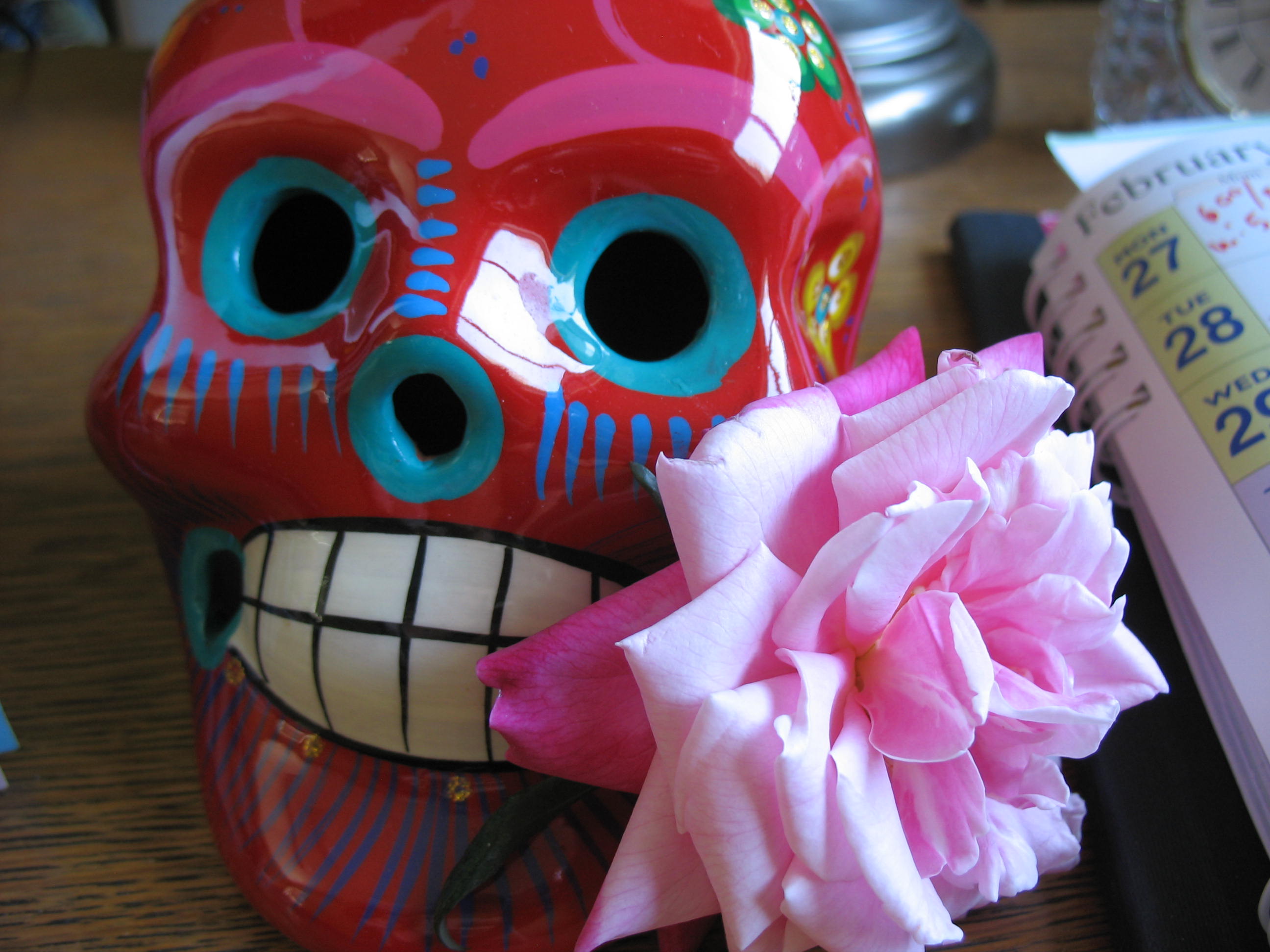 And at the end of a hard day, when I think I suck at what I do, when even the umbrelly drinks aren’t helping, I can look up from my computer screen, see the skull and laugh at the irony. Oh, Day of the Dead tchotchkes, you slay me!