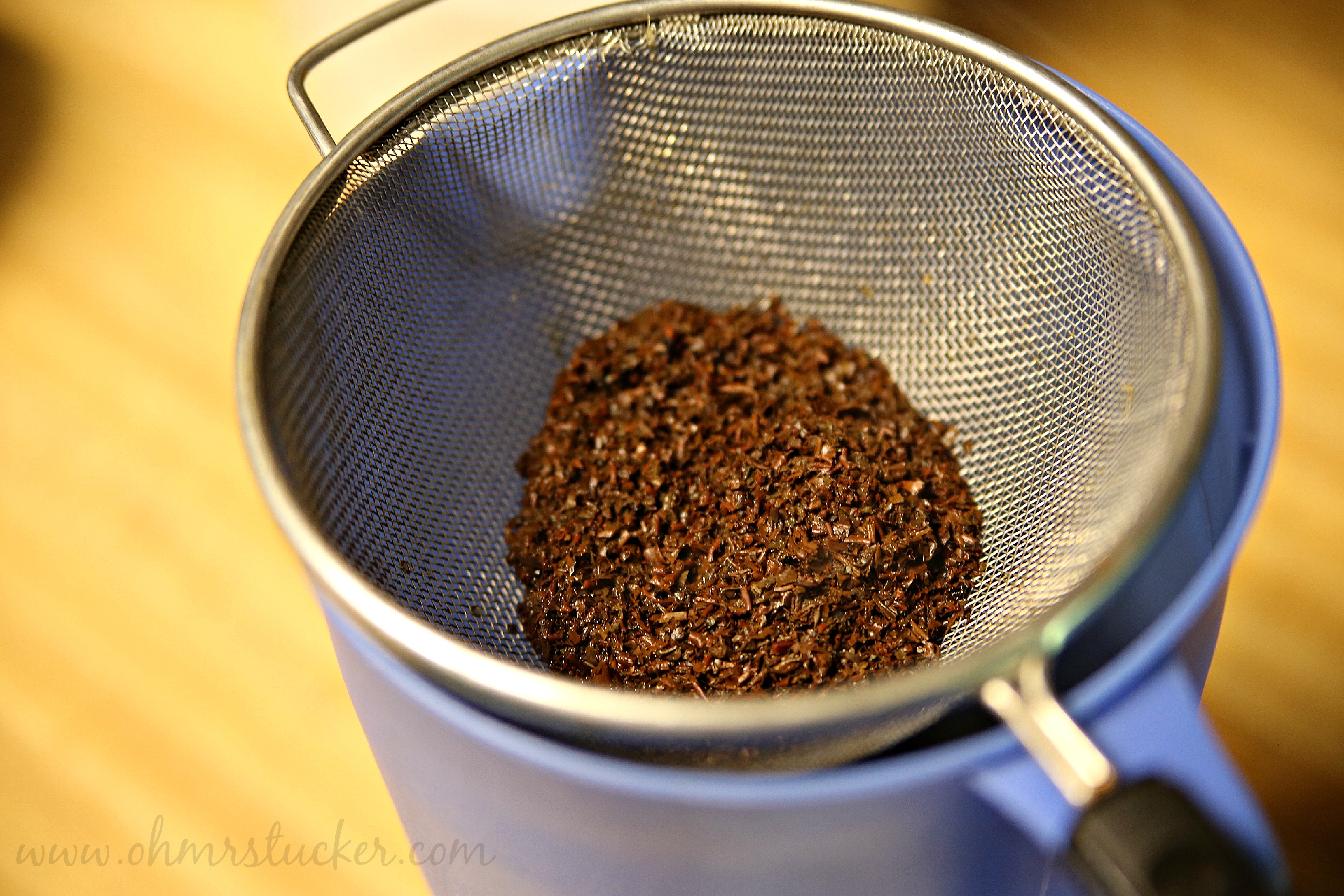 ~ Place a strainer over the top of pitcher and pour in hot tea concentrate, letting strainer catch the loose leaves.