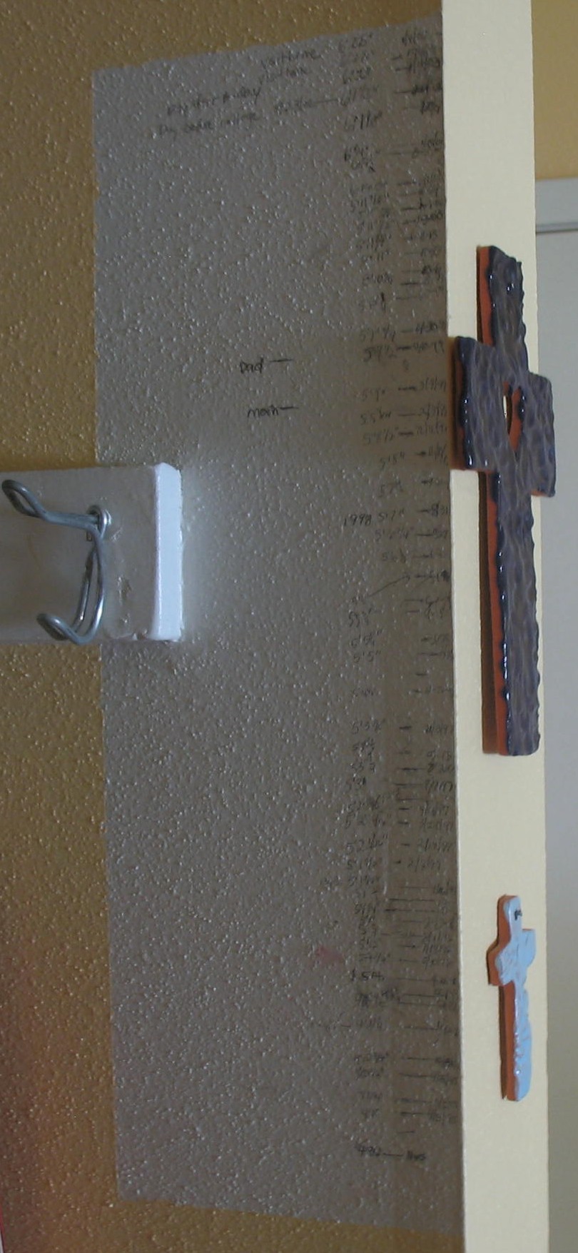 The chart is surrounded by yellow paint because when Boy left home, I took over his room as my office and painted it yellow. When it came time to paint the closet, I wouldn’t consider painting over the chart and decided to leave it as a testament to the Growing Years. Matter-of-fact, I have informed Husband that should we ever move from this house, I will be excising that chart to take with us before we go. Thank goodness I’m adept at sheetrock work.